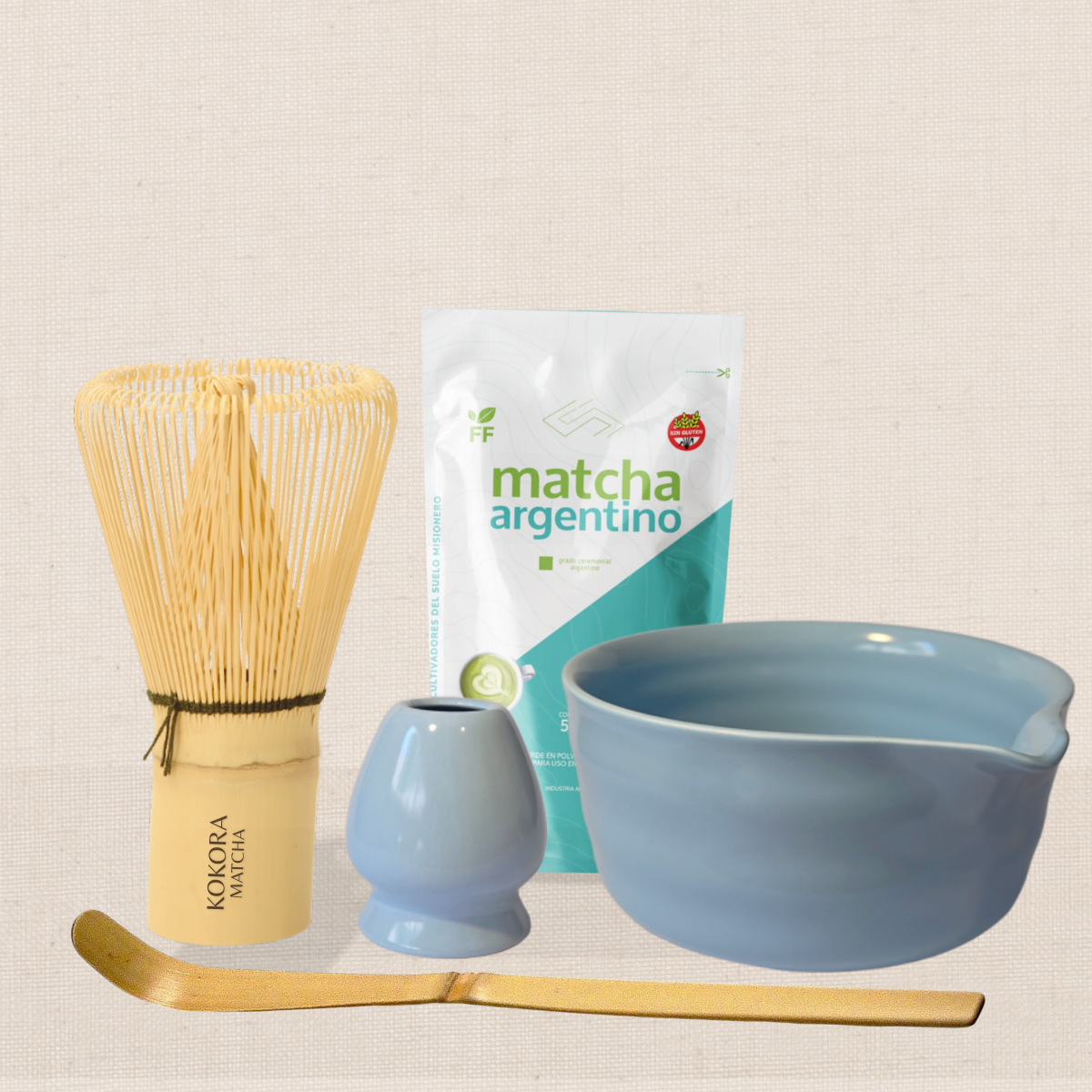 Set de Ceremonia Premium: Matcha 50g + Chawan + Chasen + Chashaku + Naoshi: Celeste