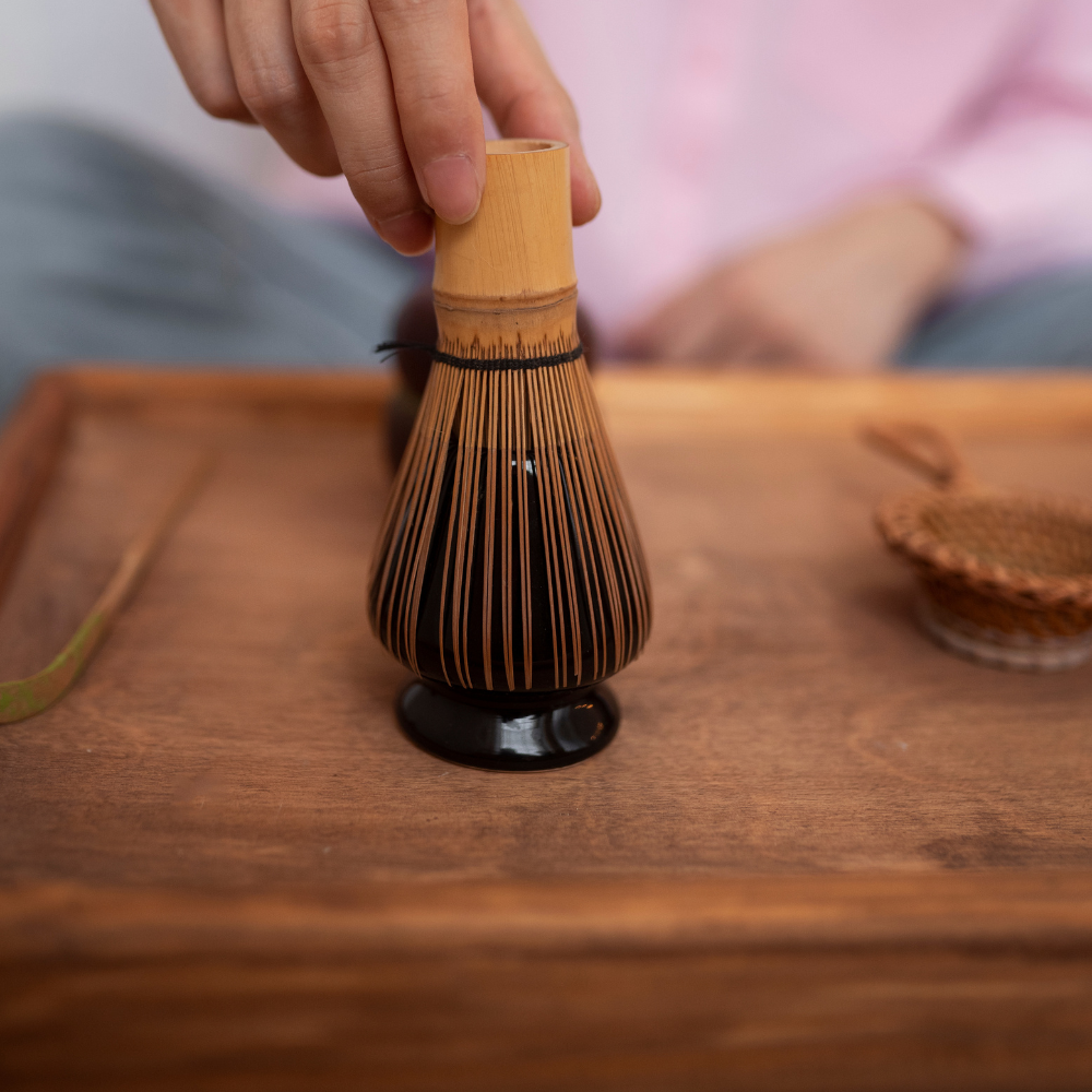 🌸 Chasen Edición Flor: El batidor de bambú artesanal con un diseño exclusivo. Sus 100 varillas aseguran una espuma densa y profesional, convirtiendo el batido en un espectáculo visual.